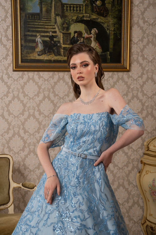 فستان لامير مستوحى من لون البحر الازرق الجميل ، مميز بقصة صدر مستقيمة و اكمام منخفضة مطرز يدويا بالكامل بخرز مكون من 3 الوان : الازرق الفاتح، الازرق الفضي و الازرق الزمردي الناعم