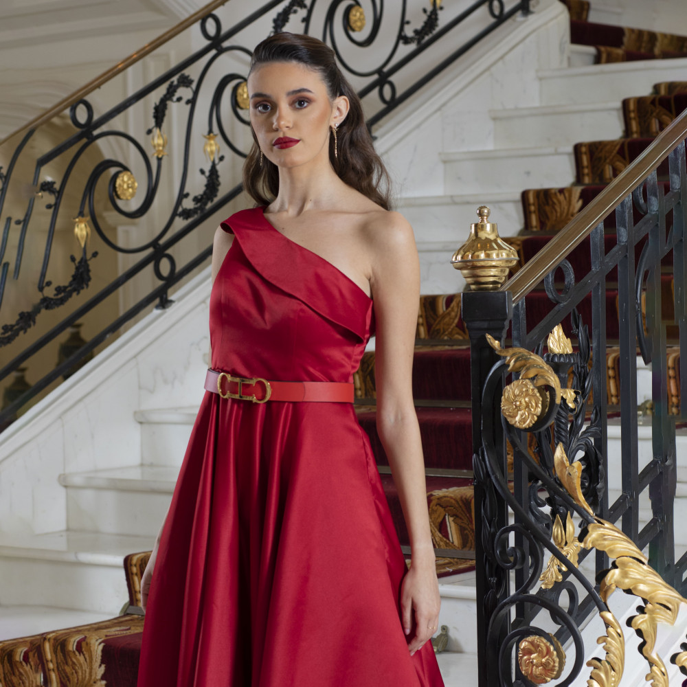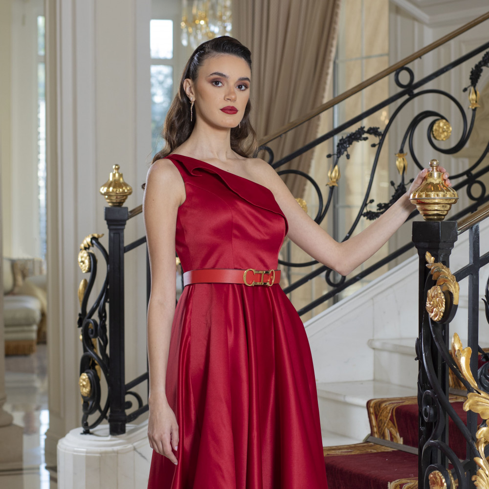 فستان سادة كلاسيكي باللون الاحمر الملكي من قماش التفتة الساتان الايطالي