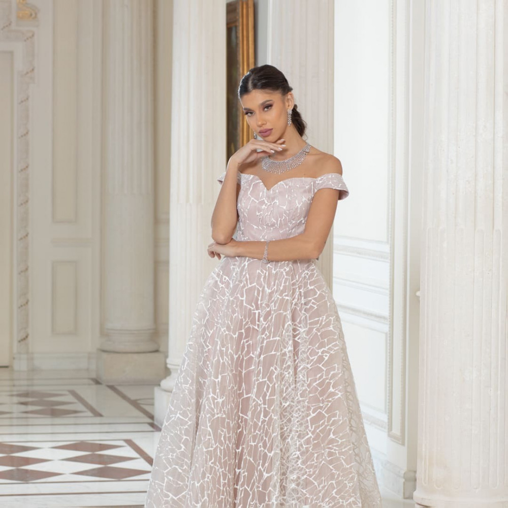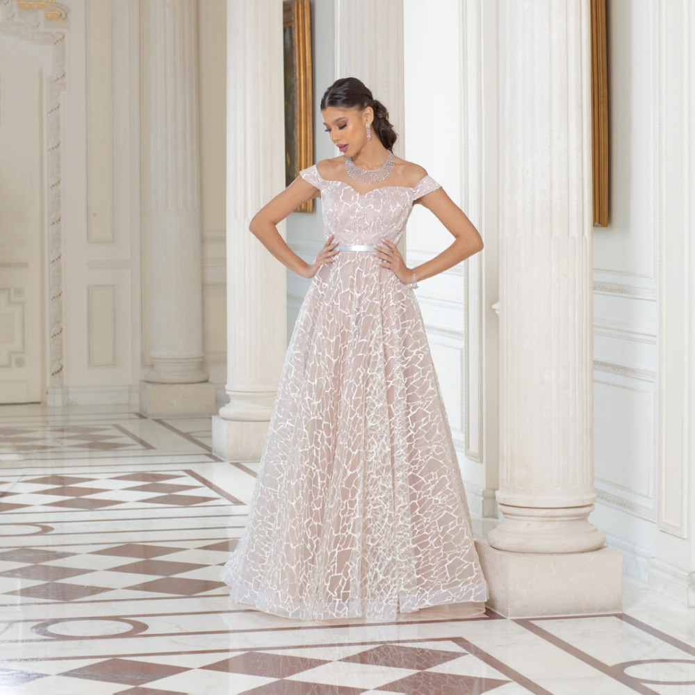 الفستان آليس باللون الزهري الفاتح بقصة سويت هارت مطرز بحبيبات السكر البيضاء الناعمة و الجلتر باشكال