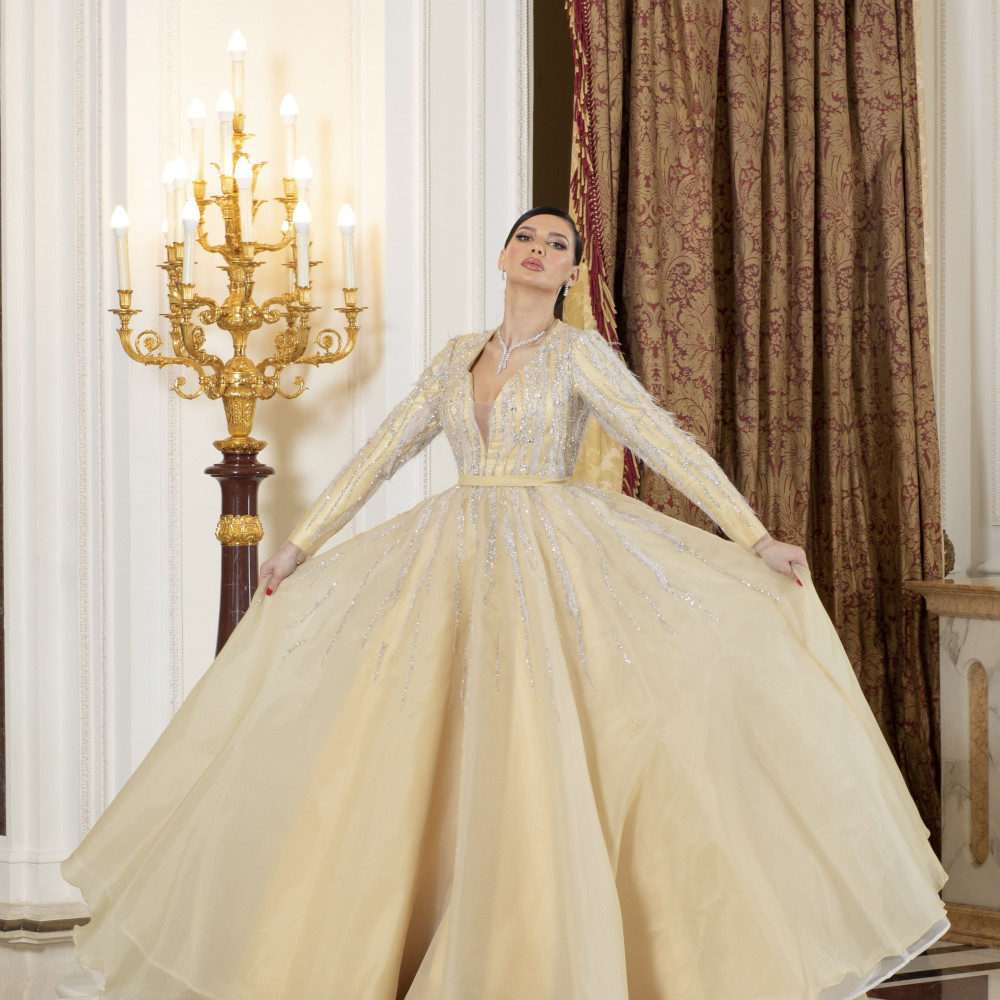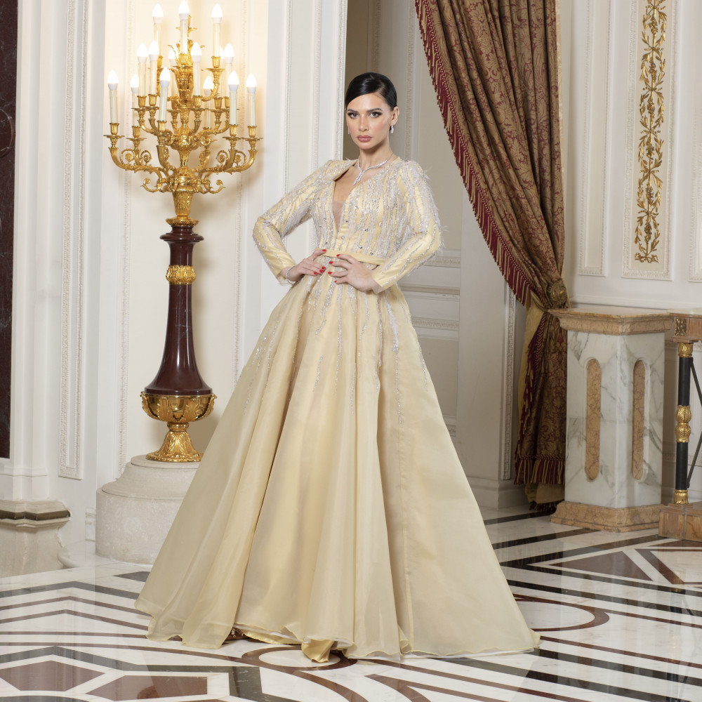 فستان روفان المميز بقماش الاورجانزا الايطالي و قصة الصدر المفتوح المطرزة بخرز السوارفسكي الفضي والريش الناعم على الاكمام