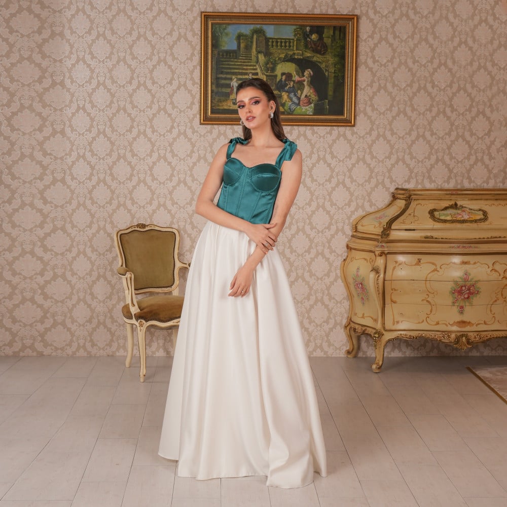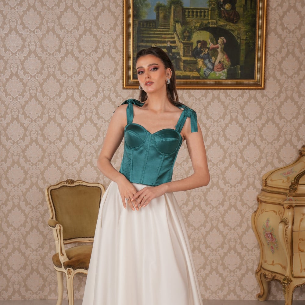 كورسيه باللون الاخضر الغامق مع حبال عريضة تربط بشكل وردة