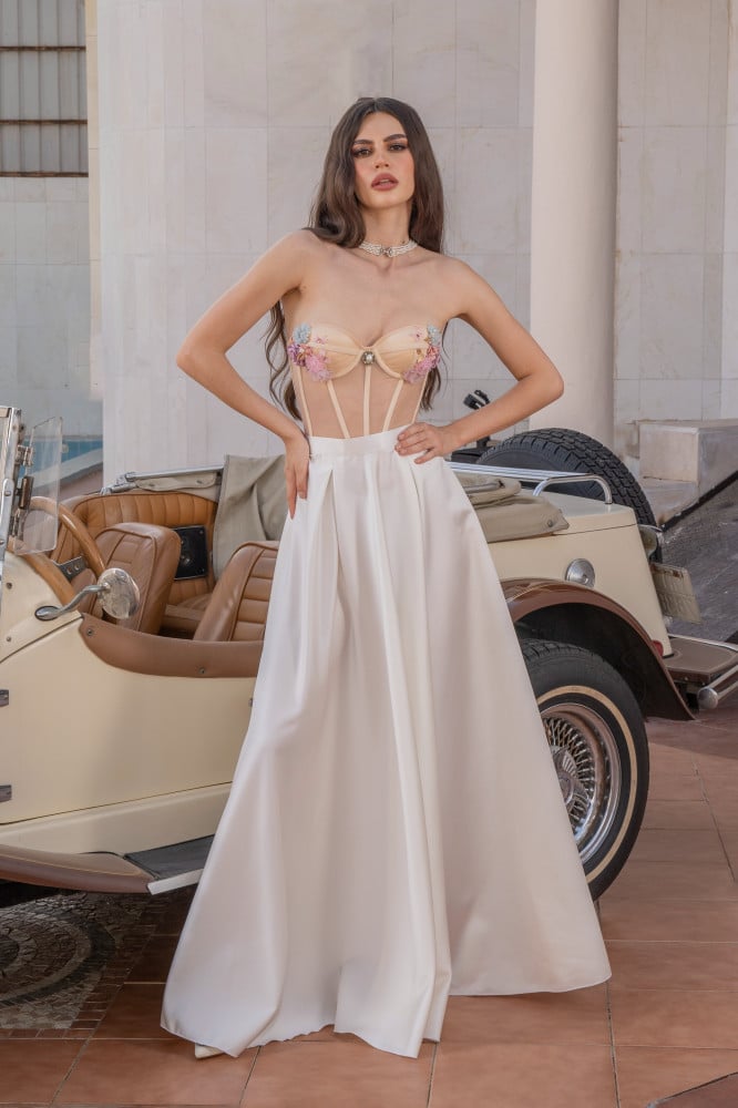 فلاوري فنتج كورسيه باللون البيج الجميل مع الورود الانيقة المركبة يدويا لاطلالة ربيعية صيفية مثيرة